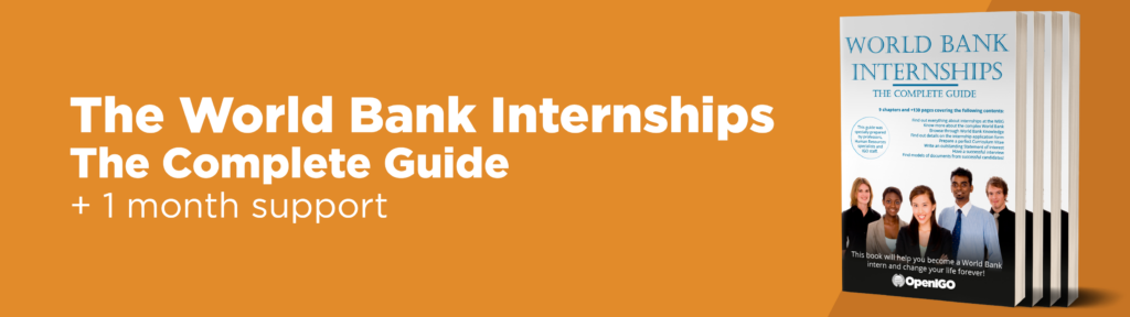 To help you land your dream internship at the Bank, we have prepared this comprehensive ebook about the World Bank Internship Program. It doesn’t matter if you don’t have connections or previous experience at the Bank: with our eBook, you will be equipped for each of the selection stages, knowing how to convey your profile to recruiters in the application process and how to impress the interviews!