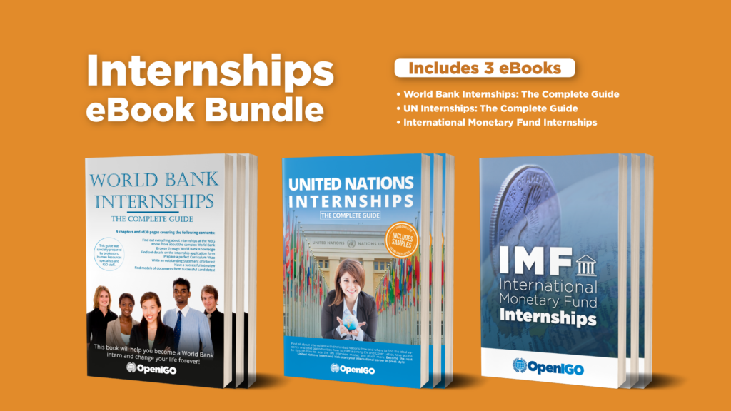 This bundle is comprised of the most comprehensive content about the main internship programs in intergovernmental organizations around the world. If your goal is to start your career at the United Nations (UN), the World Bank, or the International Monetary Fund (IMF), you will be wholly covered by this package, with the most up-to-date information about the main internship program of each of these organizations, giving you essential tips to prepare for every single stage of these selection processes.