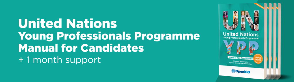 The UN YPP selection process is carried out once a year and comprises several stages: an online application form, a written exam, and a competency-based interview. That’s why we have prepared this comprehensive UN YPP Manual for Candidates, an eBook to help you better understand the program and get you ready for all of its stages, with crucial tips that will give you the boost you need to perform successfully in this competitive selection process.