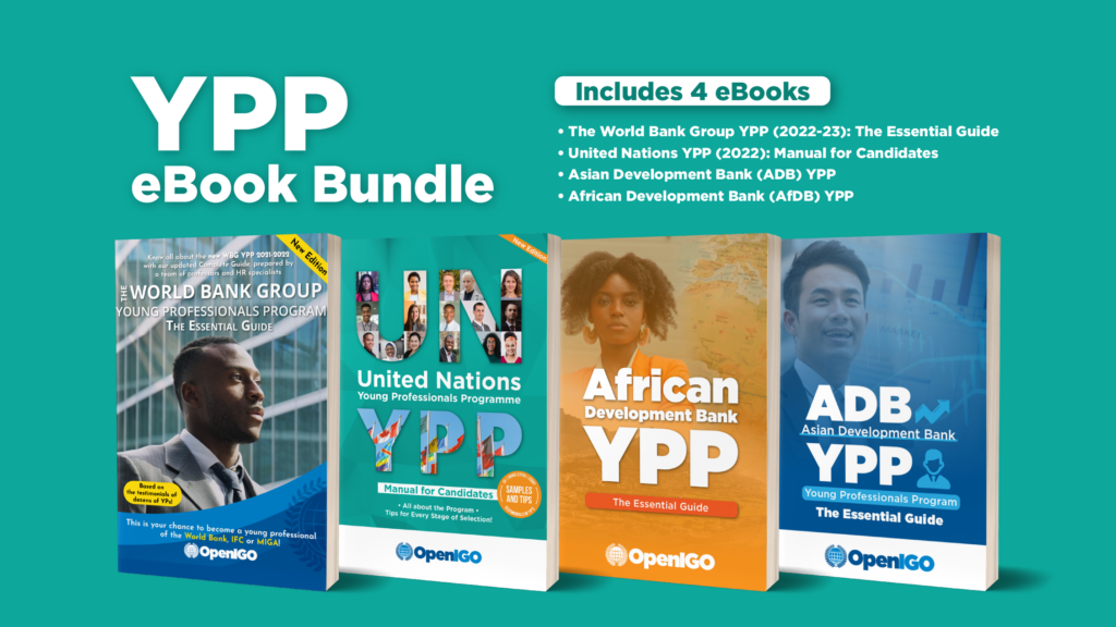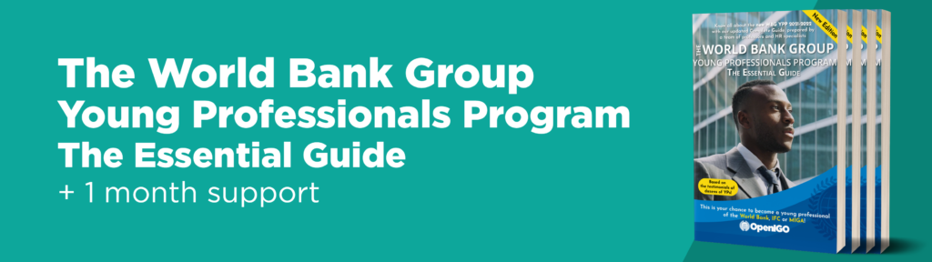 Being selected for the WBG YPP can change your life forever, but this is no easy task. That’s why we have prepared the World Bank Group YPP Essential Guide, an eBook created to help you perform successfully in every stage of the WBG YPP, even if you do not have connections or previous experience at the Bank.